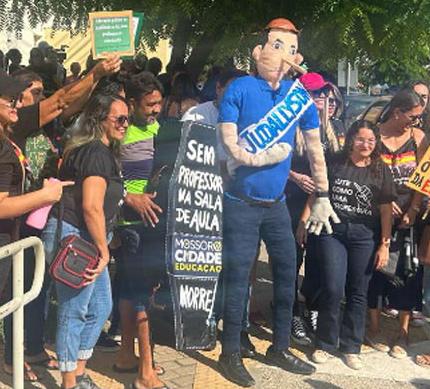 mostrar à população que o prefeito Allyson mente quando diz que honra o piso salarial da categoria. “Judallyson” foi símbolo da última greve dos professores, em maio.