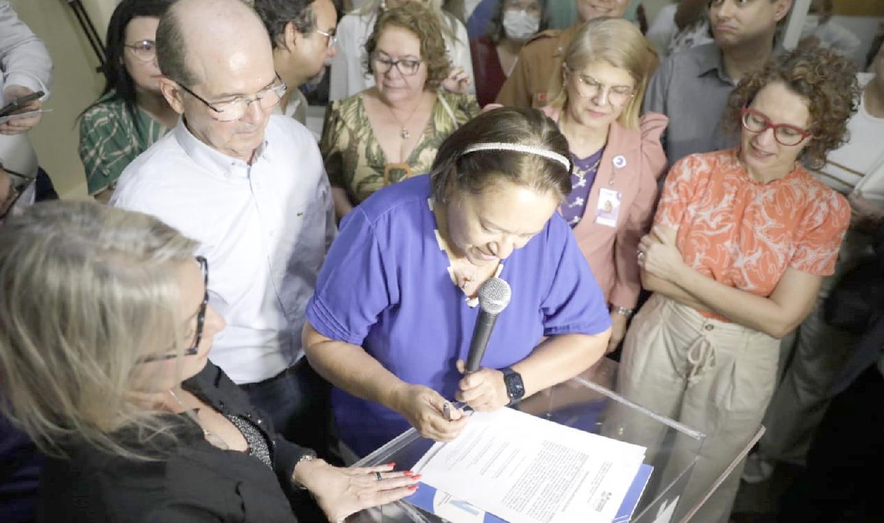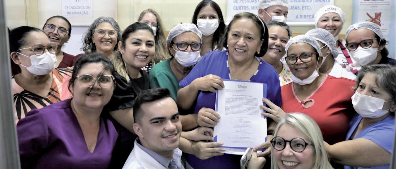 Governadora Fátima Bezerra, com servidores do Hospital Regional Tarcísio Maia, em Mossoró, mostra a ordem de serviço assinada nesta quinta-feira, 24