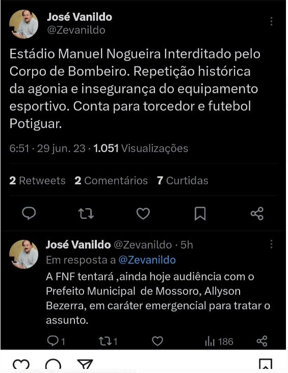 “Estádio Manuel Nogueira Interditado pelo Corpo de Bombeiro. Repetição histórica da agonia e insegurança do equipamento esportivo. Conta para torcedor e futebol Potiguar”, informou Vanildo, que iria tentar uma audiência com o prefeito de Mossoró, Alysson Bezerra, para tratar do assunto. O estádio é gerido pelo Município.