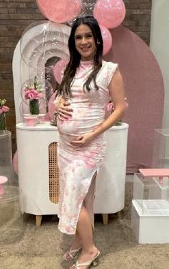 A gravidíssima Aline Almeida, só alegria, no Chá de Sofia.