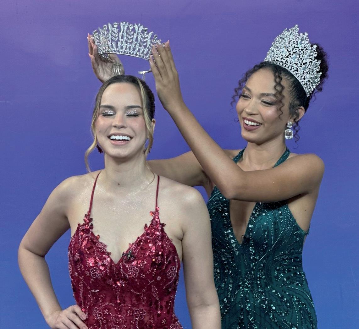 O estúdio do programa Entre no Clima, na TCM, foi palco para muita beleza na tarde de ontem, 19, com a aclamação da Miss Rio Grande do Norte Supranacional 2026, Miriam Benjamim. Ela recebeu a coroa pelas mãos de Suênya Romão, Miss Rio Grande do Norte 2025. Ambas usando vestido da Maison Elegance.