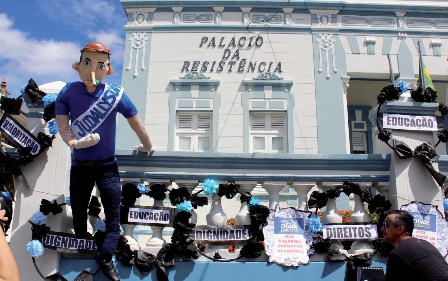 Professores levaram o boneco “Judallyson” para protestos na frente do Palácio da Resistência, sede da prefeitura