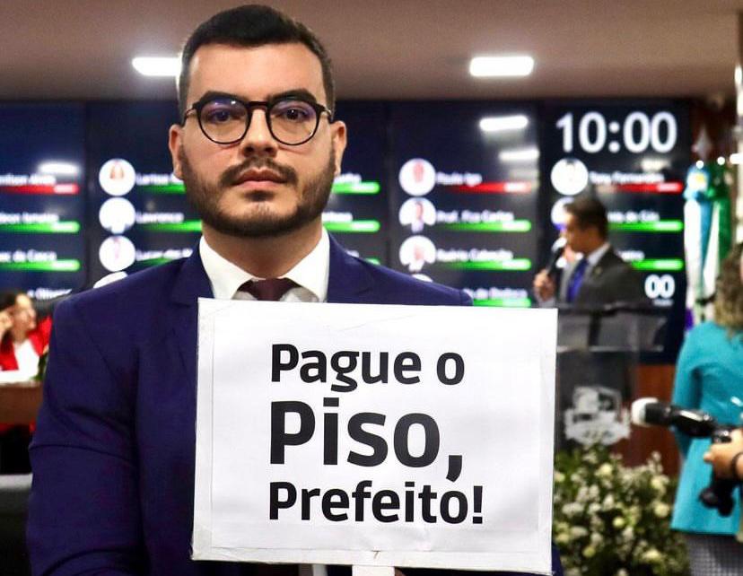 Não houve pressão, mas, sim, cobranças. A presença do prefeito Allyson Bezerra (Solidariedade) para a leitura da mensagem anual, nesta terça-feira, 14, foi pautada pelo movimento que defende o cumprimento da lei nacional do piso salarial do Magistério. No plenário da Casa, o vereador independente Pablo Aires (PSB) exibiu a placa: “Pague o Piso, prefeito!”. Nas galerias, professores e professoras cobram a abertura de diálogo e negociação da pauta da Educação municipal.