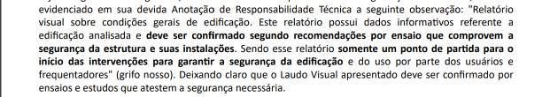 “Deixando claro que o Laudo Visual apresentado deve ser confirmado por ensaios e estudos que atestem a segurança necessária”, completou, deixando evidente a insatisfação ao suposto documento carente (Laudo Visual) de qualida-