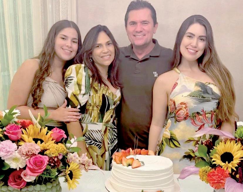 Lins, aniversariante de 2 de agosto, recebendo o carinho do esposo Francisco Lins e das filhas