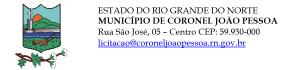 O MUNICÍPIO DE CORONEL JOÃO PESSOA, por intermédio da SECRETARIA MUNICIPAL DE OBRAS, TRANSPORTES E SERVIÇOS URBANO torna público a realização de procedimento licitatório, em sessão pública, na modalidade CONCORRÊNCIA, do tipo menor preço global, sob a forma de execução indireta, no regime de empreitada por preço unitário, na forma ELETRÔNICA, nos termos da Lei nº 14.133, de 2021 e demais legislação aplicável, cujo objeto é a contratação dos serviços de pavimentação em paralelepípedos em pedra calcária, pelo método convencional em diversas ruas na zona urbana do município de Coronel João Pessoa/ RN, conforme projeto básico. As propostas e documentos serão recebidos virtualmente no site https://www.portaldecompraspublicas.com.br até o dia 10/07/2025 às 08h00min, quando iniciará às 08h30min, conforme especificações e normas contidas no Edital e seus Anexos, disponíveis no endereço eletrônico acima ou no site www.coroneljoaopessoa.rn.gov.br. Coronel João Pessoa/RN, 25 de junho de 2025. Miguel Ferreira de Aquino Agente de Contratação