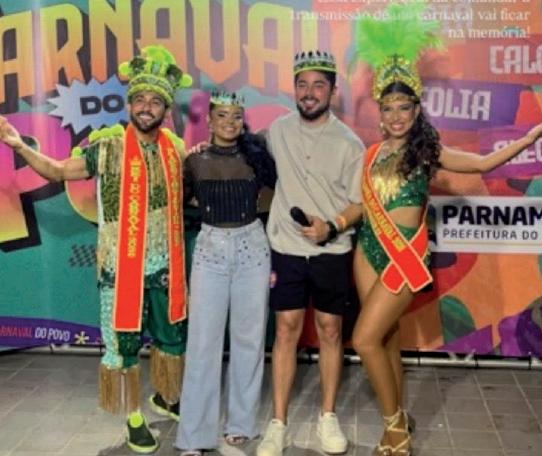 O Rei e Rainha do Carnaval de Parnamirim, Willian Thomaz e Mariana Bignotti, com os apresentadores Anderson Lopes e Andretta, a dupla que comandou a transmissão do Carnaval do Povo para o canal da Prefeitura de Parnamirim.