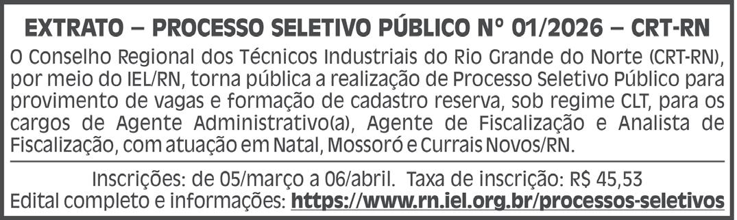 A Prefeitura Municipal de Tenente Ananias/RN, no uso de suas atribuições legais, com fundamento no art. 79, inciso I, da Lei Federal nº 14.133/2021, na Lei Complementar nº 123/2006 e suas alterações (Lei Complementar nº 147/2014), na Lei Federal nº 11.488/2007, na Instrução Normativa nº 05/2024 – GS, bem como nas normas que regem o Programa Nacional de Alimentação Escolar – PNAE, torna público que realizará CREDENCIAMENTO DE PESSOAS JURÍDICAS ESPECIALIZADAS NO FORNECIMENTO DE GÊNEROS ALIMENTÍCIOS, DESTINADOS AO PREPARO DA ALIMENTAÇÃO ESCOLAR DOS ALUNOS DA REDE MUNICIPAL DE ENSINO, EM CONFORMIDADE COM O CARDÁPIO ELABORADO POR NUTRICIONISTA HABILITADO, PARAATENDIMENTO AO PNAE, CONFORME ESPECIFICAÇÕES CONSTANTES NO TERMO DE REFERÊNCIA – ANEXO I, EM CONFORMIDADE COM O ART. 79 INCISO I DA LEI 14.133/2021. O credenciamento ocorrerá de forma presencial, no período de 05/03/2026 a 12/03/2026, no horário das 08h00min às 12h00min, na sede da Prefeitura Municipal de Tenente Ananias/RN, localizada à Rua Antônio Fortunato dos Santos, s/n, Centro, Tenente Ananias/RN – CEP: 59.955-000. O Edital e seus anexos estarão disponíveis, na íntegra, no sítio eletrônico oficial do Município: https://tenenteananias.rn.gov.br Tenente Ananias-RN, 02 de Março de 2026. Francisco Felipe Gomes Jacome Secretário Municipal de Educação