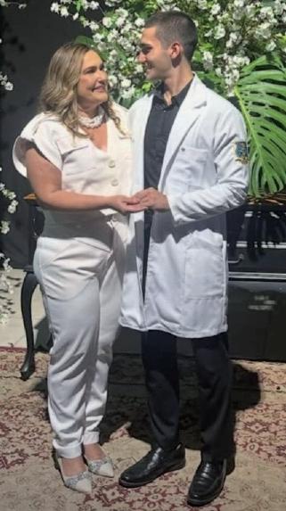 A Magistrada Daniela Rosado na cerimônia do jaleco com o filho Eduardo, que ingressa no curso de medicina da Ufersa. Salve, salve!