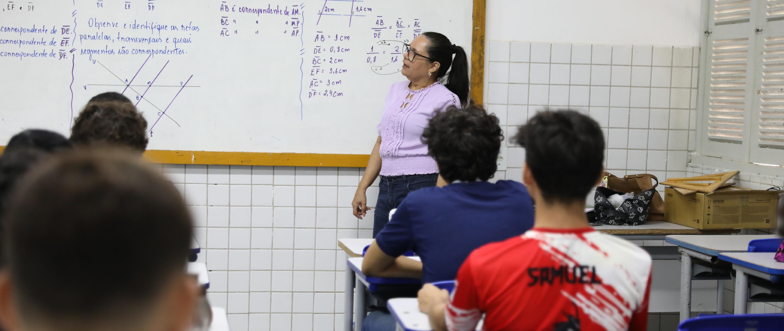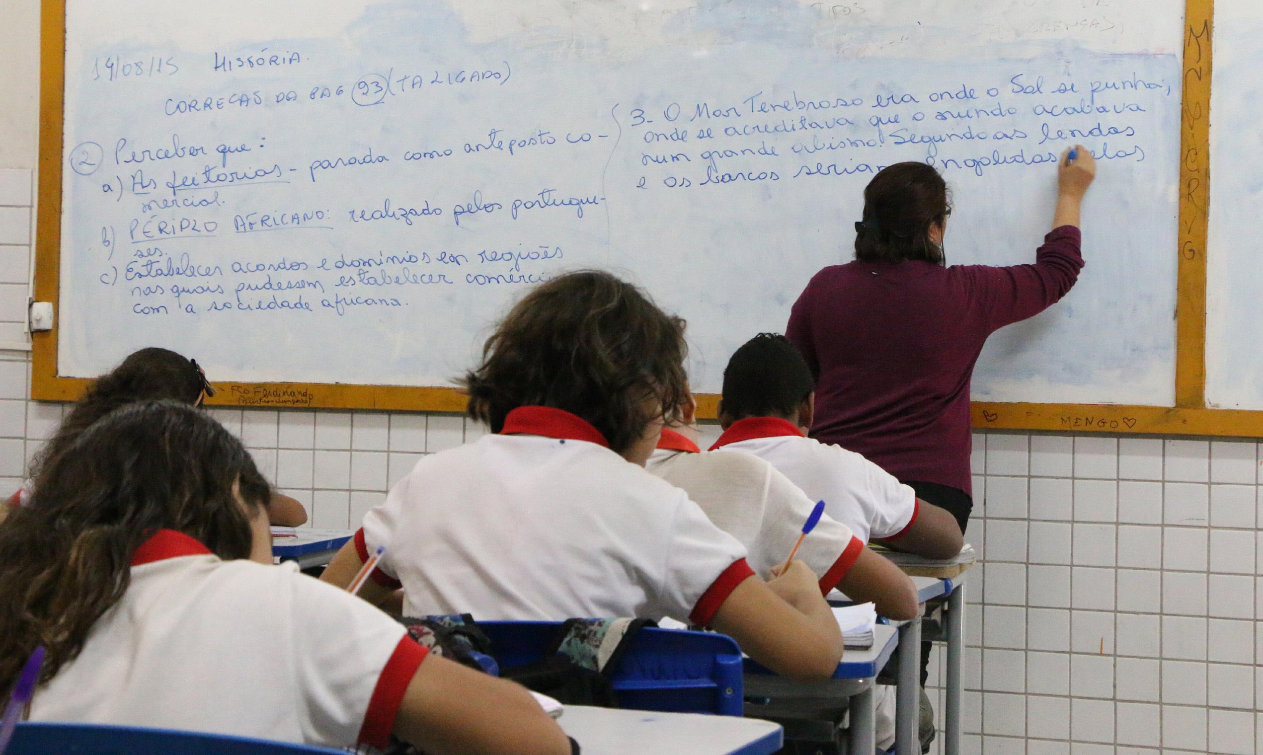 Professora em sala de aula de escola da rede estadual de ensino, que será fortalecida com o Plano de retomada de Obras