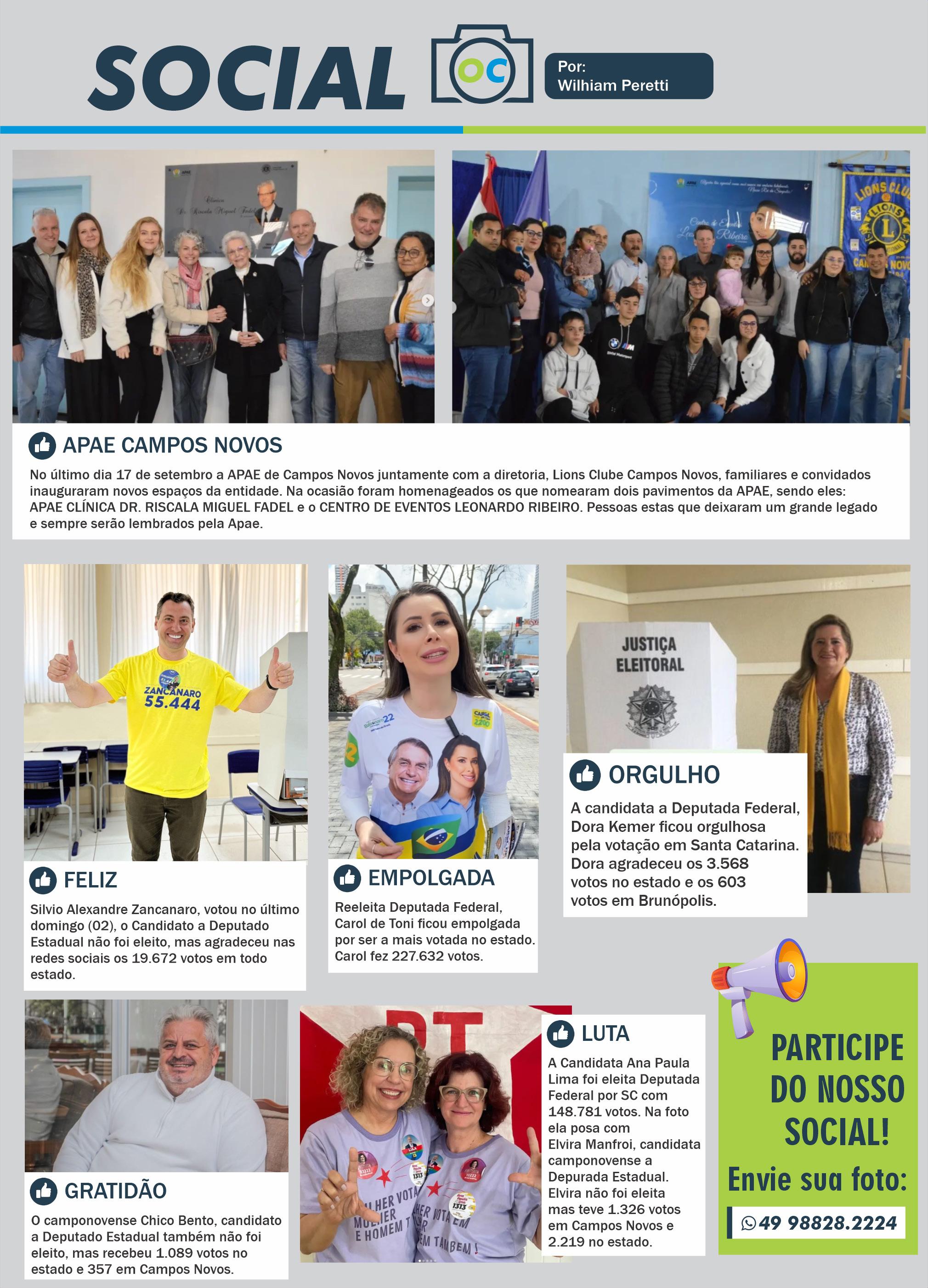 César Valduga (PC do B), nasci do no Distrito de Barra do Leão, totalizou 14.665 votos, sendo 115 no município. Já a candidata Elvira Manfroi, que concorria a uma cadeira na ALESC pelo PT, fez o total de 2.202 votos, boa parte deles conquista dos em Campos Novos, correspondente a 1.326 votos. E por fim, pelo MDB, concor reu o candidato Chico Bento, que atingiu o total de 1.056 votos, 357 deles feitos em Campos Novos.