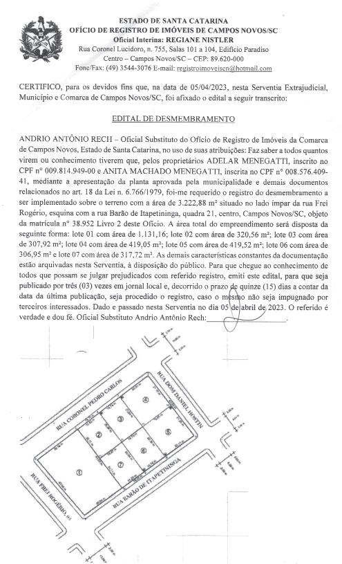 Imóvel Rural, parte ideal de 90.000,00m2, correspondente a 09 hectares (somente terra nua), de um TERRENO situado no Município de Campos Novos, matriculado no Registro de Imóveis de Campos Novos sob nº 4.733 (rural), com área total de 1.407.076,67m². Avaliação: R$ 434.388,34. Não havendo arrematantes na primeira praça/leilão, o imóvel será oferecido em segunda praça/leilão pelo valor de R$ 222.000,00, considerando 51% da avaliação. A íntegra do edital e demais informações estão publicados no site www.soleiloes.com.br