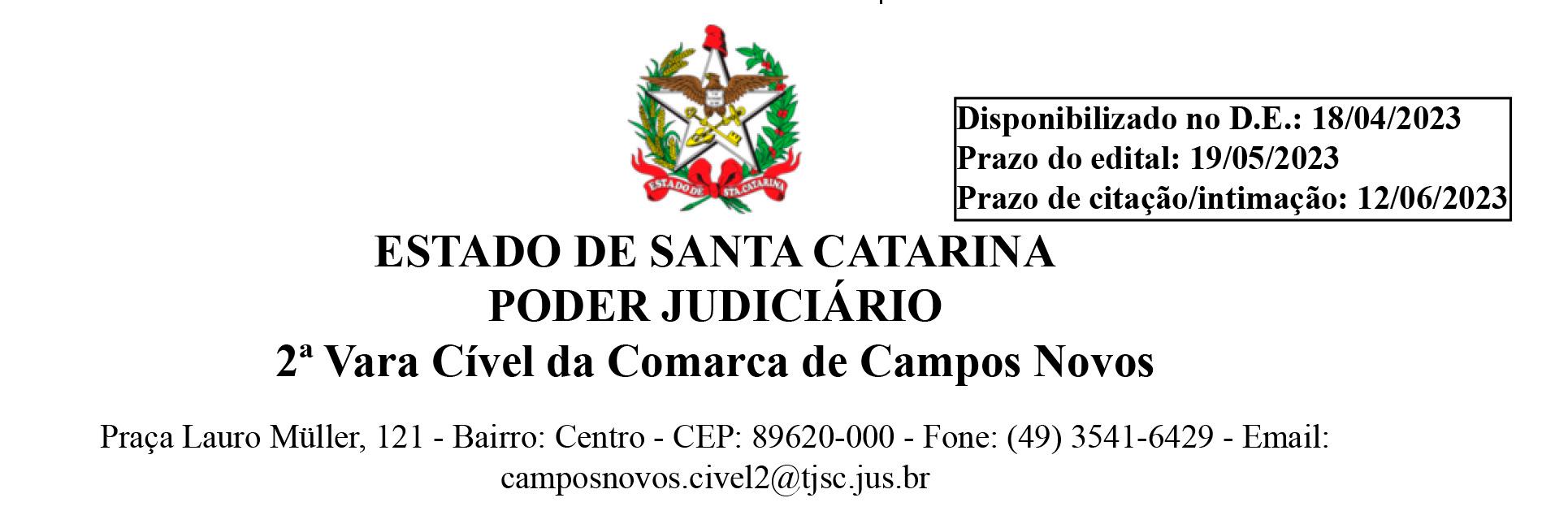 Reús e terceiros interessados. Prazo do Edital: 10 dias. Descrição dos Bens: Bem 01 - Um terreno rural com área de 3,4557 ha, dentro de uma área maior, 133.100m², localizado na comunidade de Ramo Verde, interior da cidade de Brunópolis, SC, com as confrontações descritas na matrícula n. 27.253 do CRI da Comarca de Campos Novos - SC. Bem 02 - Um terreno rural com área de 2,375 ha, dentro de uma área maior, 121.000,00m², localizado na comunidade de Ramo Verde, interior da cidade de Brunópolis, SC, com as confrontações descritas na matrícula n. 39.148 do CRI da Comarca de Campos Novos - SC; Bem 03 - Um terreno rural, com área de 23.7827 ha, dentro de uma área maior, 289.267,33m², localizado na comunidade de Lageado dos Borbas, interior da cidade de Brunópolis, SC, com as confrontações descritas na matrícula n. 3.695 do CRI da Comarca de Campos Novos - SC. Medida Liminar Concedida: Isto posto: Ante requerimento de gratuidade judiciária formulada em sede de contestação, com fulcro no art. 99 do CPC, intime-se a parte expropriada para, no prazo de 15 (quinze) dia, colacionar aos autos documentos a fim de comprovarem sua alegada hipossuficiência, a exemplo de comprovante de rendimentos, declaração de imposto de renda, certidão positiva/negativa de bens móveis e imóveis, sob pena de não concessão do benefício. DEPOSITADO o valor apurado na avaliação prévia, com base no art. 15 do Decreto Lei acima citado, DEFIRO a liminar pleiteada na inicial. Expeça-se o competente mandado de imissão da posse da área elencada na inicial e descrita nos mapas e memoriais descritivos, podendo o Oficial de Justiça valer-se da força policial caso necessário. Cumpridas as formalidades legais atinentes à imissão provisória da autora na posse da terra, oficie-se ao Registro de Imóveis para que proceda a averbação provisória. Atentando-se ao acima explanado, encerrada a ação de inventário de n. 0301616-61.2019.8.24.0022, prejudicado, por ora, o requerimento de levantamento de valores; Sem prejuízo de habilitação pela parte ré, intime-se as parte autora para, no prazo de 15 (quinze) dias, proceder a devida adequação do polo passivo, com consequente habilitação dos sucessores/herdeiros de Imidia Alves Fernandes Ferreira e atuais proprietários dos imóveis objeto da desapropriação (vide plano de partilha anexado nos autos 0301616-61.2019.8.24.0022). Colacionada referida informação, cite-se. Na mesma oportunidade, intime-se da avaliação efetivada. Tudo cumprido, voltem conclusos com a devida urgência para determinação do que de direito. Intime-se. Cumprase. Pelo presente, a(s) pessoa(s) acima identificada(s), atualmente em local incerto ou não sabido, FICA(M) CIENTE(S) de que neste Juízo de Direito tramitam os autos do processo epigrafado e também INTIMADA(S) da concessão da medida liminar, com imissão de posse provisória do autor sobre a área litigiosa, transcrita na parte superior deste edital. E para que chegue ao conhecimento de todos, partes e terceiros, foi expedido o presente edital, o qual será afixado no local de costume e publicado 1 (uma) vez(es), sem intervalo de dias, na forma da lei.