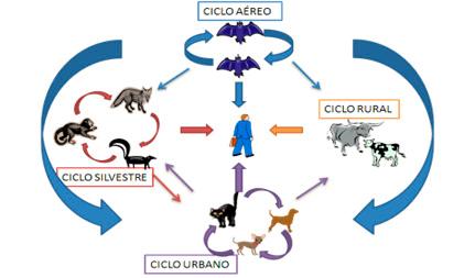 O ciclo rural da raiva, dos animais de produção, geralmente ocorre pelo ataque do morcego 'vampiro' (Desmodus rotundus) que morde os animais do rebanho para se alimentar, e que se aloja em locais como cavernas, foges e buracos. A mordida causa intenso sangramento no local da ferida, porém, apenas provocará a