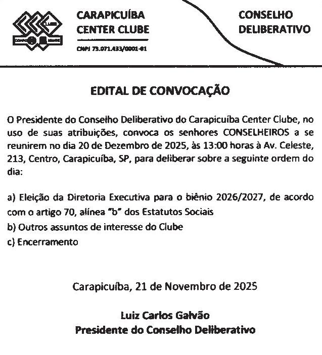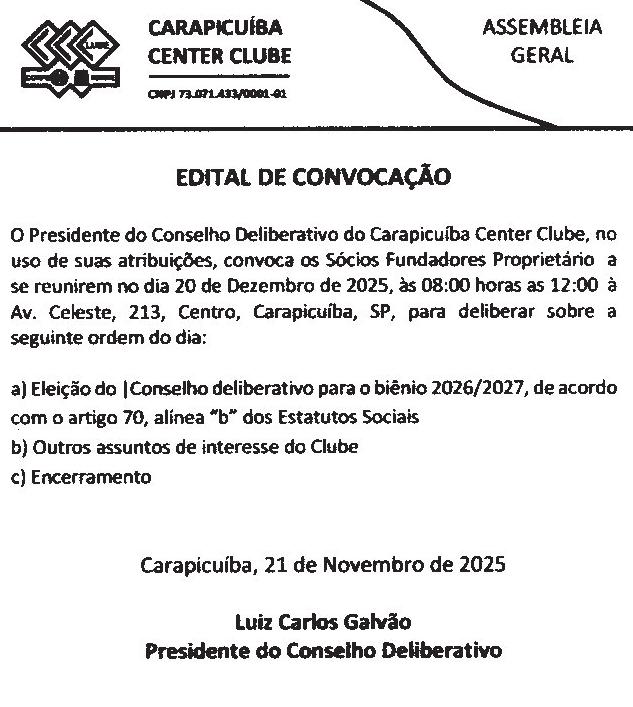 O pleito está marcado para o dia 15 de dezembro de 2025, das 8 às 12h30, na Sala Luiz Roberto Claudino da Silva, localizada na avenida Lázaro de Mello Brandão, 300, Vila Campesina.