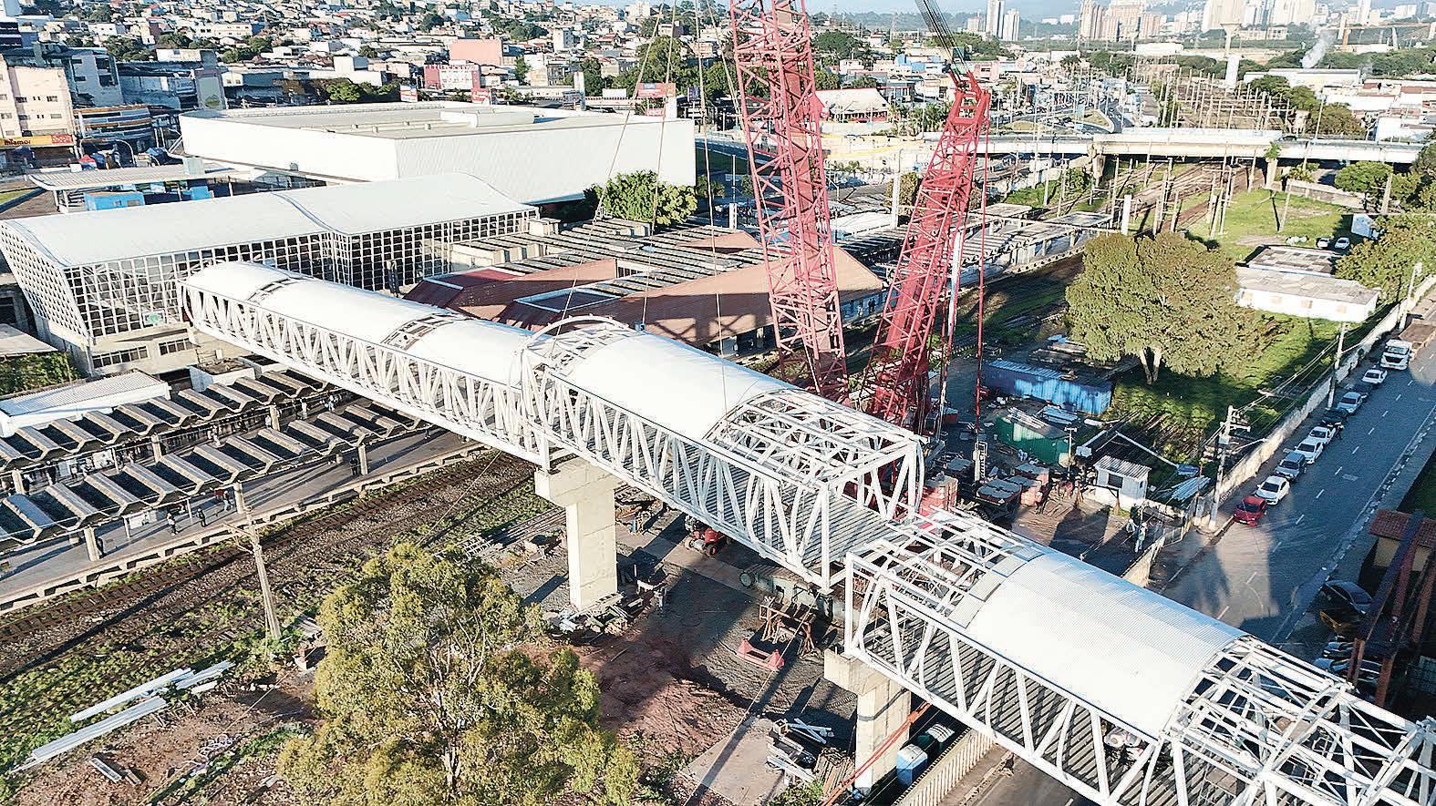 governo do Estado de São Paulo, na madrugada de domingo, 23/11, foi instalado o primeiro módulo de 66 metros da passarela. Na terça-feira, 25, foi erguido o segundo e, na quarta-feira, 26, encaixou-se o terceiro e último módulo do equipamento que terá 112 metros de extensão e 7 metros de largura. Com isso, está concluída a etapa mais complexa da obra que caminha agora para receber os acabamentos finais.