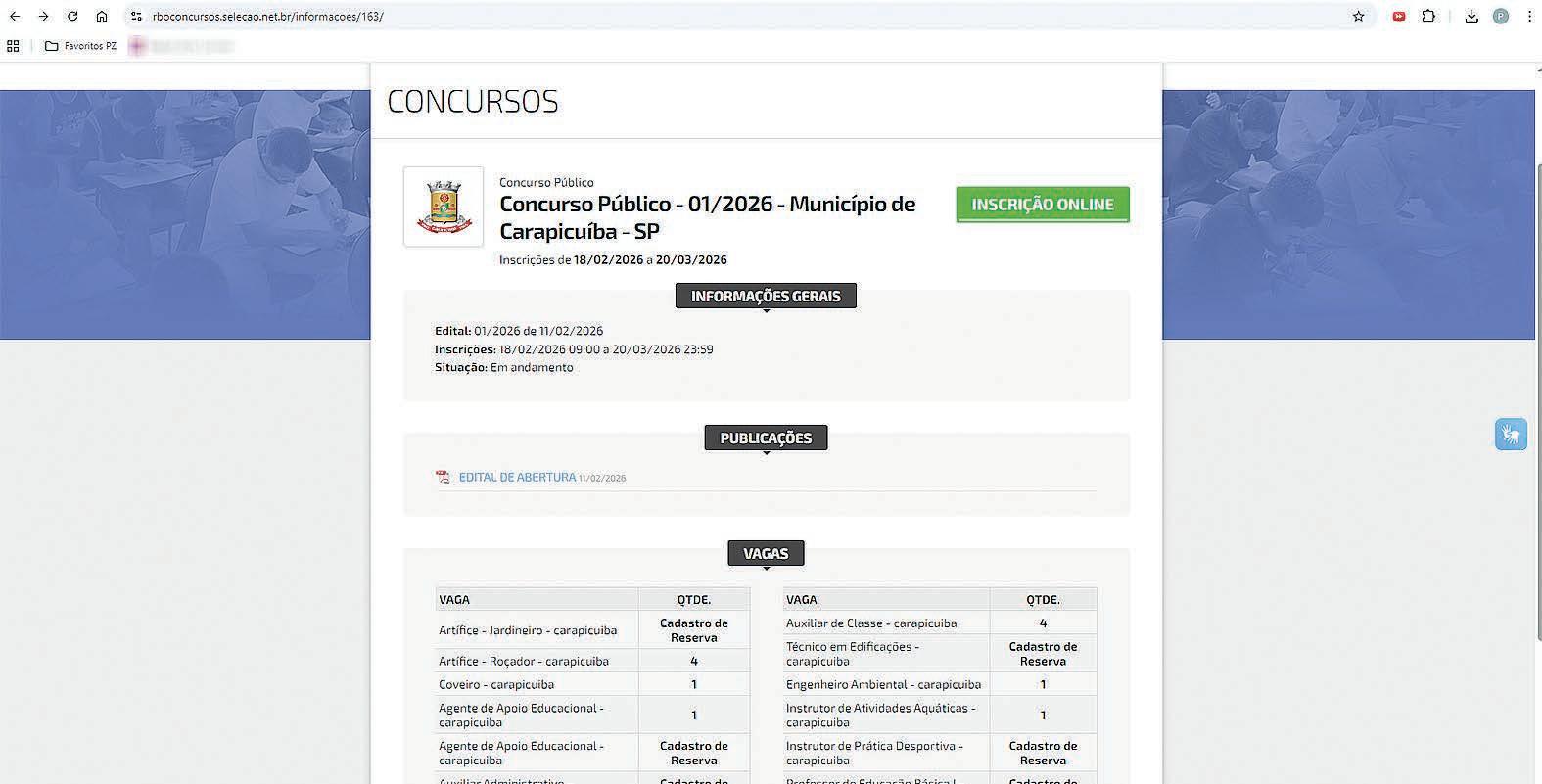 -line, no período já iniciado no dia 18/2, e que se estende até 20 de março de 2026, através do site https://rboconcursos.selecao.net.