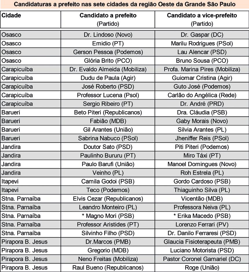 Considerando-se as atas dessas convenções e os registros apontados no site do TSE, as sete cidades da região Oeste da Grande São Paulo apresentaram 28 intenções de candidaturas aos cargos de prefeito. Esse número é 41,6% inferior ao de candidatos registrados na última eleição municipal, em 2020.