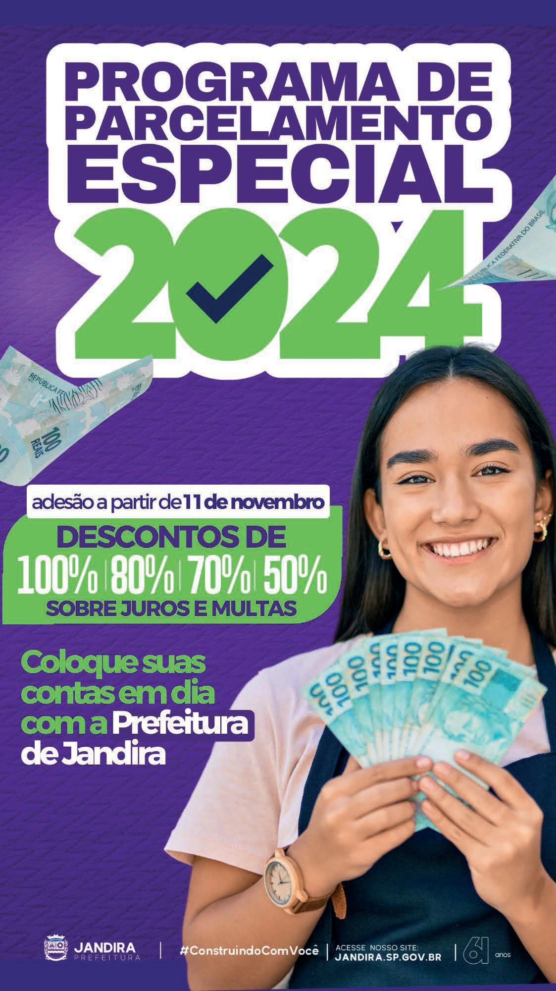 A partir da próxima semana, segunda-feira, dia 11/11, os munícipes em dívida com os cofres da Prefeitura de Jandira poderão aderir a um novo plano de parcelamento dos débitos, com descontos nos juros e multas. O Programa de Parcelamento Especial (PPE) incluirá todos os débitos computados até 31 de dezembro de 2023.