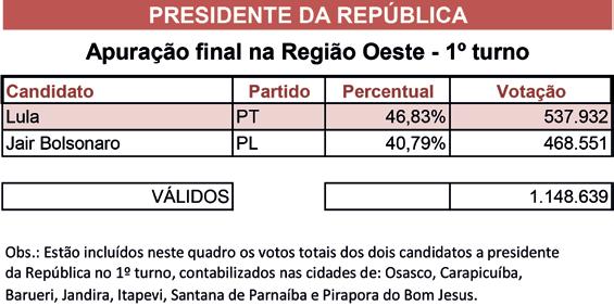 No universo compreendido entre as sete cidades que compõem a região Oeste da Grande São Paulo por onde circula este jornal Página Zero, quem levou a melhor no 1º turno foi o candidato do PT, Lula. Ele venceu em seis cidades (Osasco, Carapicuíba, Barueri, Jandira, Itapevi e Pirapora do Bom Jesus) enquanto Jair Bolsonaro ficou na primeira colocação somente em Santana de Parnaíba.