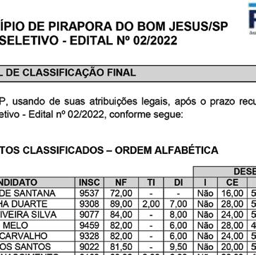 A Prefeitura Municipal de Pirapora do Bom Jesus torna público o EDITAL DE CLASSIFICAÇÃO FINAL E O EDITAL DE HOMOLOGAÇÃO do Processo Seletivo Nº 02/2022. Os referidos arquivos, na íntegra, serão publicados nos endereços eletrônicos www.concursosrbo.com.br e www.piraporadobomjesus.sp.gov.br a partir desta data.