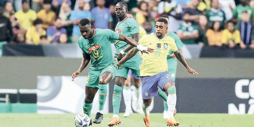 A seleção brasileira (camisa amarela) sofreu em Lisboa a virada para Senegal, campeã africana