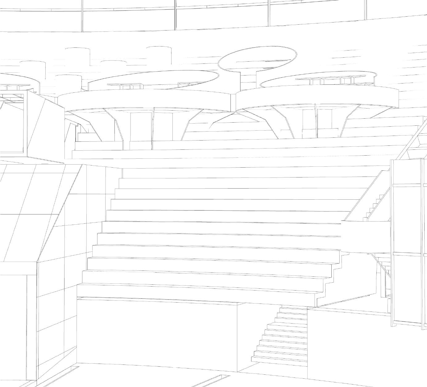 PLATAFORMA ARCHIVO y booth se crea una plataforma en el n. +6.00 para extender el espacio en el corredor principal que se encuentra en ese nivel. mientras que abajo de la plataforma se aprovecha el espacio para generar una zona de almacenamiento de archivo para la oficina y en el nivel más bajo están los booths que son cubículos individuales para mayor concentración.