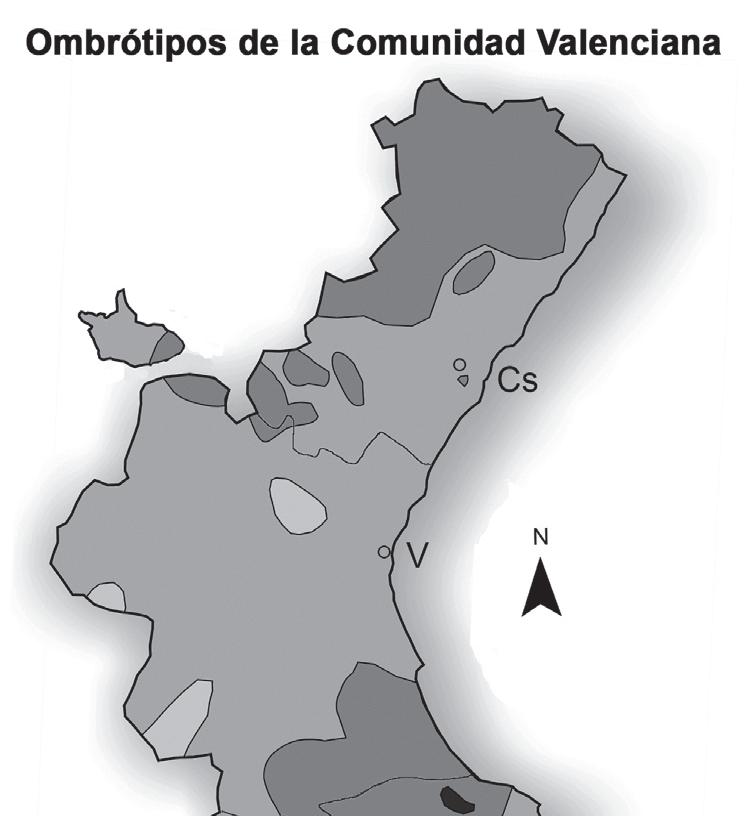 La disposición de los ombrotipos no sigue el mismo patrón que los termotipos. En la Comunidad Valenciana, el ombrotipo Semiárido se presenta en las áreas del cuarto meridional de la Comunidad, ocupando buena parte de la provincia de Alicante, y también en las áreas centrales de la provincia de Valencia, principalmente en la comarca del Camp de Turia; en ellas se encuentran algunas de los endemismos más notables y las plantas más raras de nuestra flora. El Seco domina la mayor parte del territorio, a excepción de las comarcas interiores de Castellón y el sureste de Valencia y algunos puntos del norte de Alicante. El ombrotipo