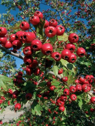 1. Hojas densas y punzantes, con una sola banda blanca ancha central. Fructificaciones maduras azuladas (foto 5) ............................................. enebro común (Juniperus communis): 1-3 m. IV-VI. Bosques y matorrales en áreas frescas. Holoárt. CC.