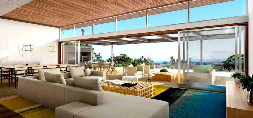 As residências térreas projetadas por Gui Mattos, de quatro ou cinco suítes com varandas, possuem janelas amplas e muito vidro, o que permite a entrada da luz natural no ambiente e ressalta a beleza da mata nativa. “O contato com a natureza fica mais evidente na varanda coberta com deck, piscina e churrasqueira, que se unem com harmonia à sala de jantar e à lareira, um espaço projetado para receber parentes e amigos”, explica Cesar.
