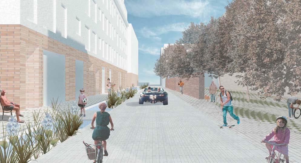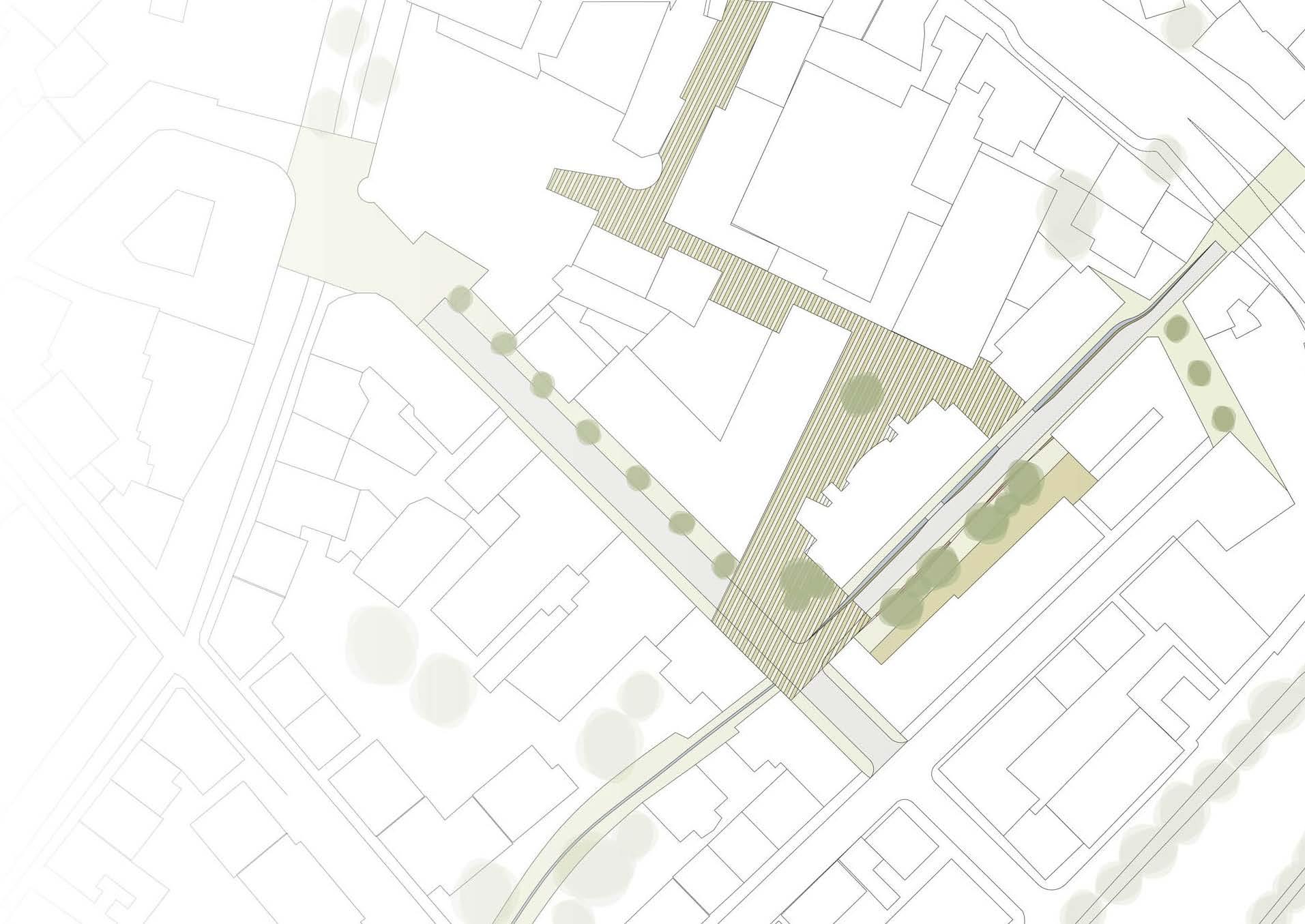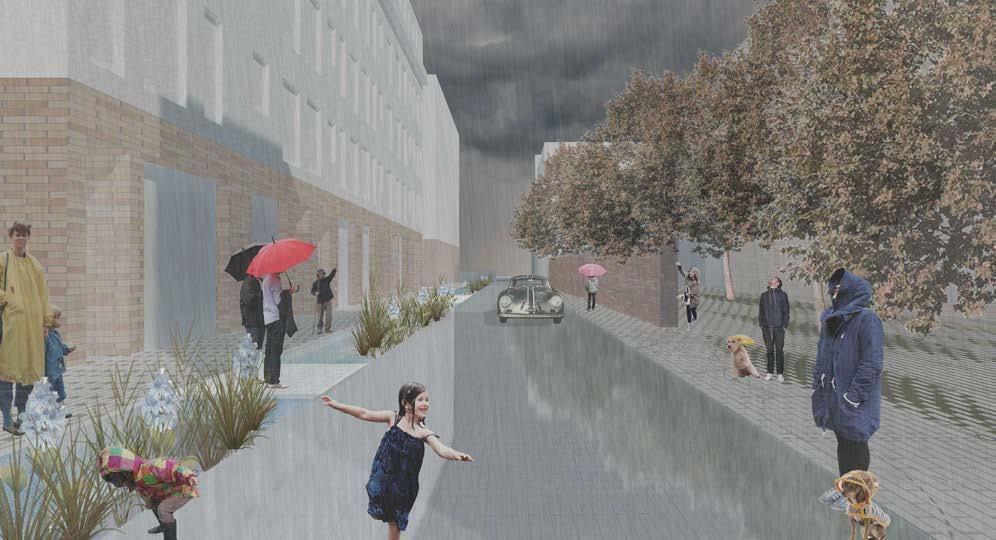 Nasenbach-Knotenpunkt Entlang des südwestlichen Straßenabschnitts werden Beschattungselemente verstärkt und erhalten. Bei Starkregenereignissen wird der Nesenbachkanal überlaufen, wodurch die Straße als Überflutungsbecken genutzt wird, das die Verdunstung und Kühlung der Umgebung ermöglicht. Das Wasser wird zurückgehalten und der langsame Abfluss durch die porösen Materialien und die kontrollierte Entwässerung gefördert. Es bietet die Möglichkeit, ein Ereignis zu schaffen, durch das der verborgene Fluss in Erscheinung tritt.