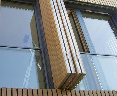 Faltschiebeläden aus nicht brennbarem Material. Holz-Alu-Fenster mit Betonplatte verschraubt.