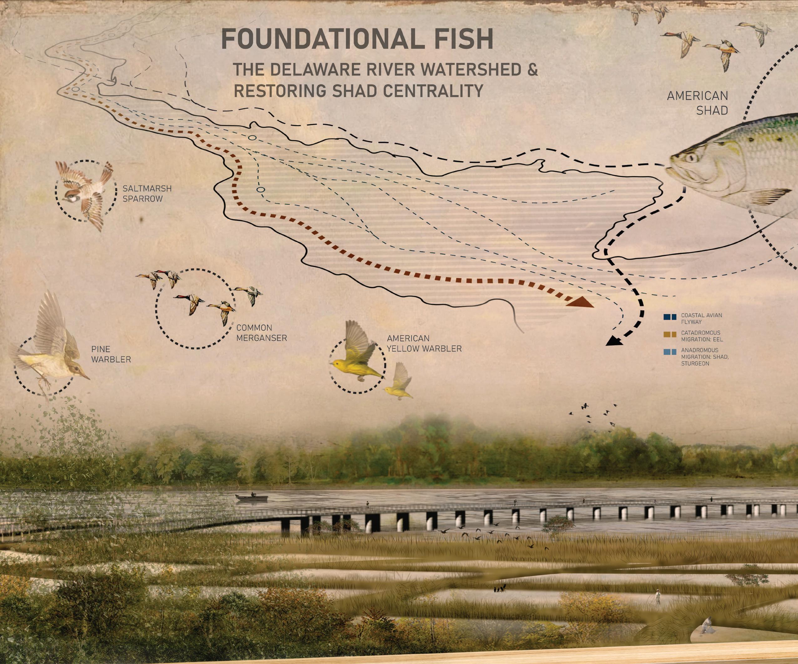 Located on the banks of the Delaware River in North Philadelphia, the design of this public space was heavily informed by a rich narrative of place. Artistic legacies of the shad fishery & working landscape by Thomas Eakins and others took the forefront of inspiration and formal logic of the park. Overlayed atop this motif, multiple elements of ecological infrasturcture are designed to fill out this once-again productive landsape. A hatchery system for native, and anadromous shad will be placed at the banks of their present and historical migratory route, to ensure their presence for generations to come.