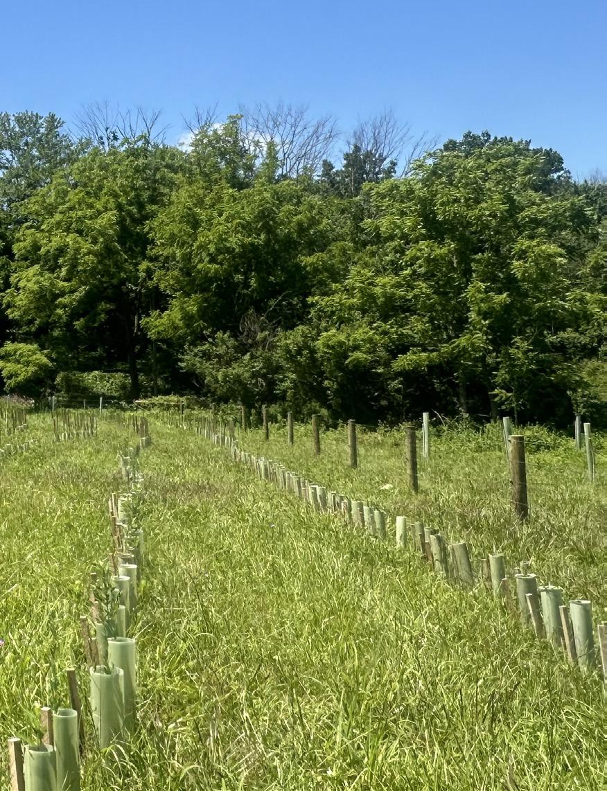 The schemes are sited in a currently fallow pasture that will host pilot test plots to be researched by the vet school and Stroud Water Center. Buffers were planted in Spring 2024 and performance and dietary preferences of buffer planting to be monitored by Vet School researchers. Dairy pasture and newly planted working buffer pictured above.