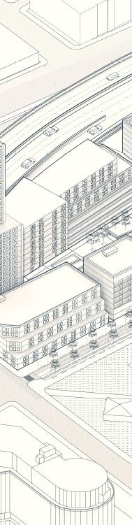 Through adaptive reuse of large vehicular infrastructure, large connective pedestrian spaces can be created, and an armature for the development of new public housing can structure the area around Franklin Square.