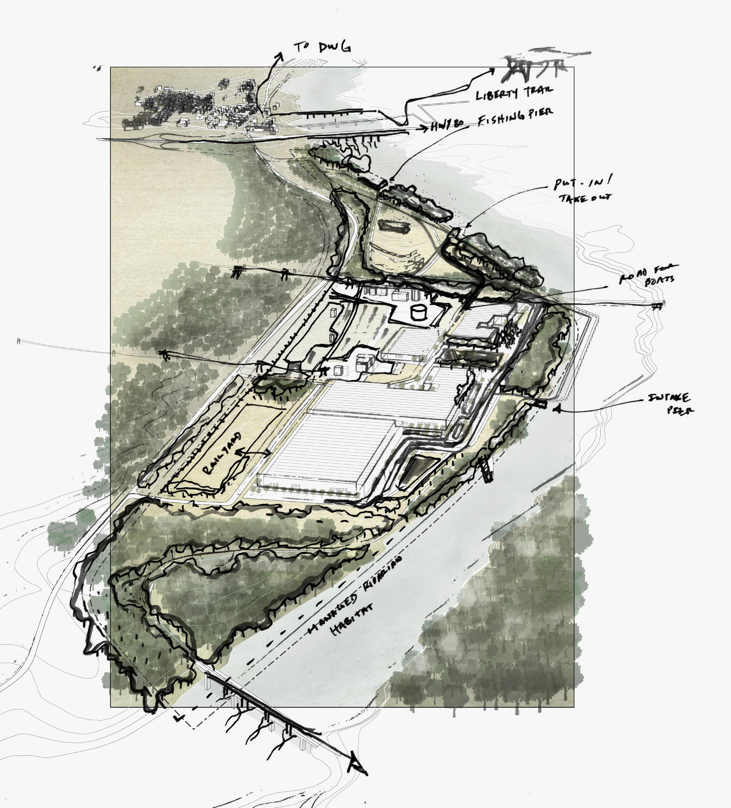 The framework plan of the entire site supports riverside recreational access and connection to existing water activities and trails. Existing agricultural land will be converted to intensively managed cropland that is designed specifically to accomodate regionally specific crops to be processed on-site.