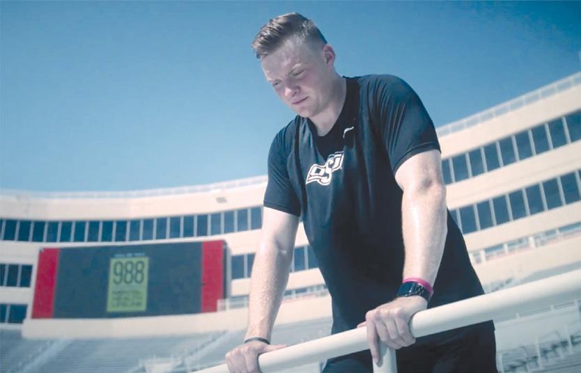 A screen capture from Alan Bowman’s 988 video shows the OSU quarterback at Boone Pickens Stadium. To see both quarterback PSAs, visit youtube. com/ 988okla. com.