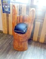 A customer of The Dam Bar at the Fort Gibson Dam carved a chair that is a replica of Charlie Blackwell’s hand for the bar. Charlie and his wife Tambra reopened the bar in early April after the building was destroyed in the 2019 flood.