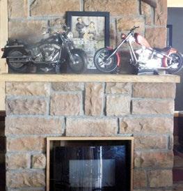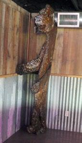 bark from a tree that was tumbled in the 2019 flood and carved a bear that sits in the corner of the stage at The Dam Bar at the Fort Gibson Dam. Charlie Blackwell said the fireplace that sits near the front entrance of the bar is “built out of leftover rock from the bottom of a house.”