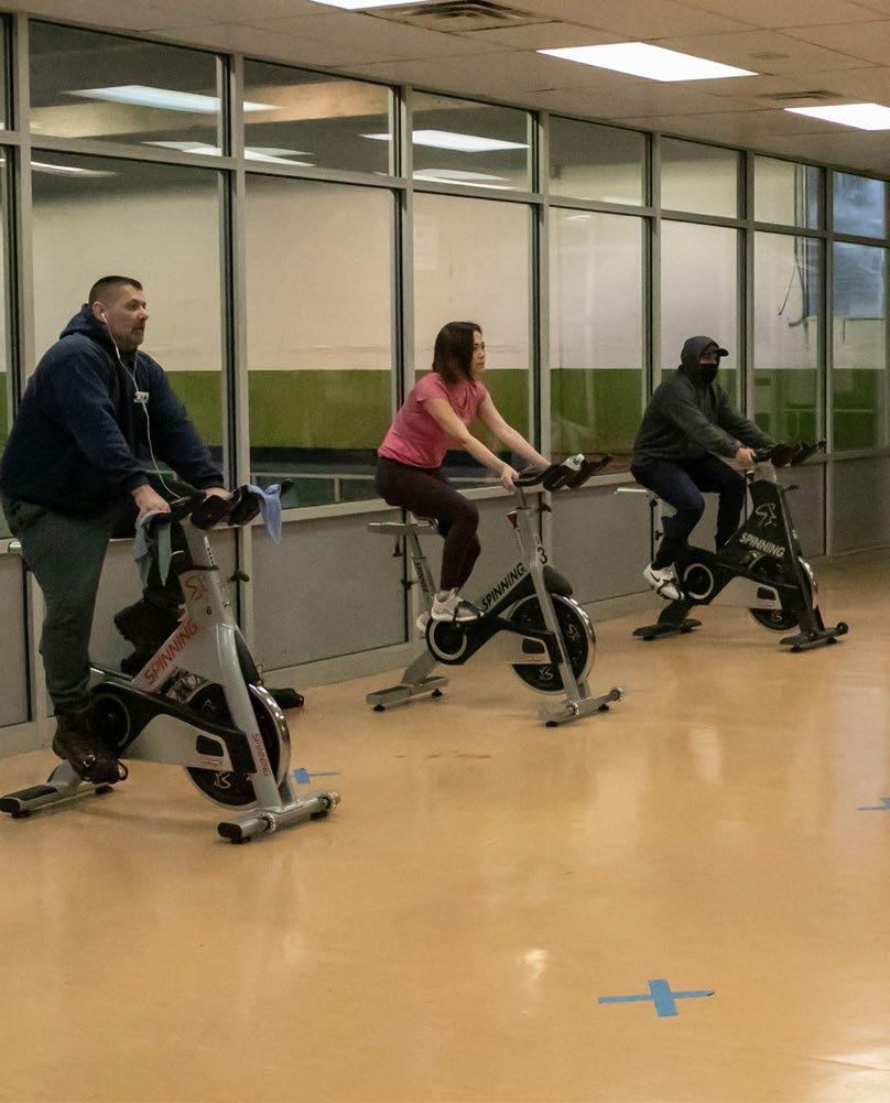 Spinning class participants, from left, Warren Blackburn, Beth Hsieh and William torres pedal at various levels during the Muskogee Swim and Fitness Center class.