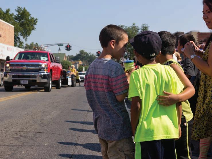 p ABOVE: Three young boys lean out during the 2015 Cherokee National Holiday parade, keeping an eye open for candy.