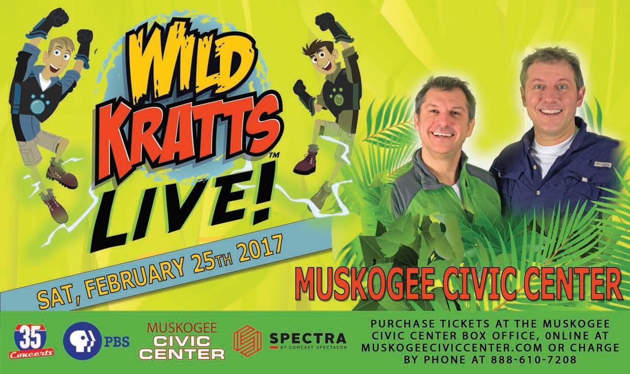 WILD KRATTS LIVE!, 1 p.m. and 4:30 p.m. Feb. 25, Muskogee Civic Center, 425 Boston St. Animated Kratt Brothers, Martin and Chris, "come to real life" in a classically Wild Kratts story. Off "To the Creature Rescue!” the Emmy-nominated Kratt Brothers activate some fan favorite Creature Power Suits to confront a comic villain. Through hilarious pratfalls and amazing animal ‘wow facts’ the Wild Kratts team rescues their favorite invention from Zach’s clutches, so the animals of the creature world are safe once again. Ticket prices are $15, $25, $35, $45 and VIP tickets with a post show meet and greet with the Kratt Brothers for $100.