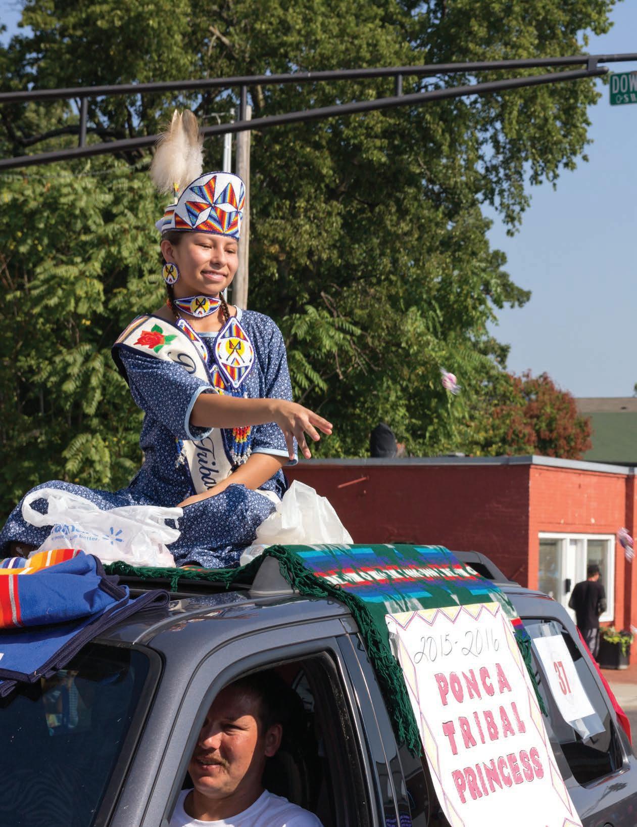 Ponca Tribal Princess Lexia Leney Kent tosses candy from the roof of a vehicle during the 2015 Cherokee National Holiday parade.