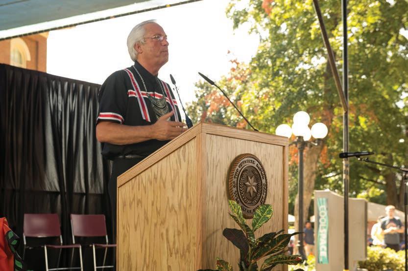 t OPPOSITE PAGE: Cherokee Nation Principal Chief Bill John Baker delivers the State of the Nation address during the 2015 Cherokee National Holiday.