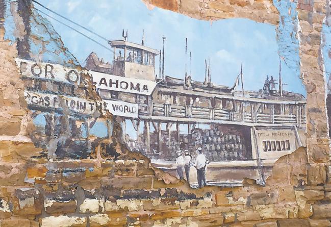 The “City of Muskogee” steamboat is one of the scenes depicted on the “Postcard” mural located in the green space downtown off the 200 block of Broadway.