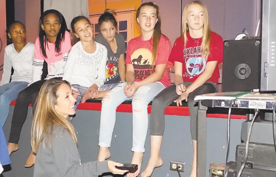 Melissa Curtis, kneeling, director of the “Nutcracker Suite” being performed at Sadler Arts Academy, watches a video with dancers in this year’s performance for pointers on fine-tuning their movements.