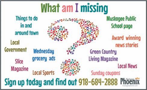 Submit calendar items and photos by noon Monday for Thursday’s Weekend section. Please include your phone number. Email features@muskogeephoenix.com, fax (918) 684-2865 or mail to Features, P.O. Box 1968, Muskogee 74402. For information, call (918) 684-2922.