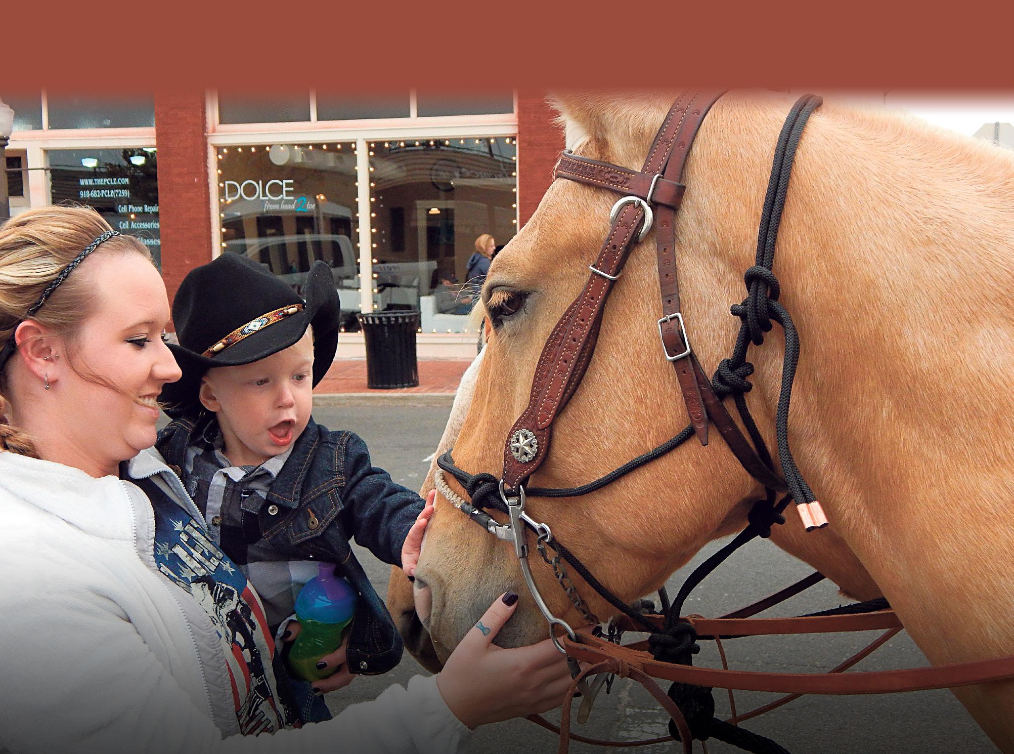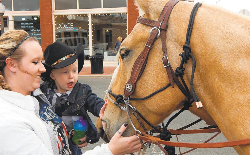 A young cowpoke, 2-year-old Brayden Kinion, and Amanda Rousey pet a police horse at Boo-Nanza. The downtown event offers trick or treating and other fun stuff for children.