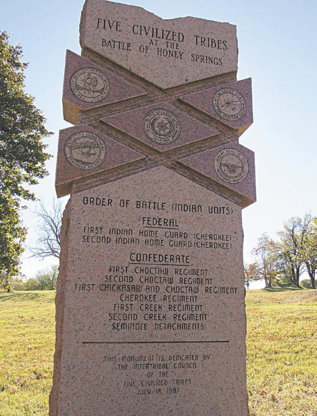 A monument at Honey Springs Battlefield Historic Site lists Cherokee, Choctaw and Muscogee (Creek) regiments and Seminole detachments that fought on both sides of the four-hour skirmish. There will be re-enactments of the Battle of Honey Springs this Saturday and Sunday.