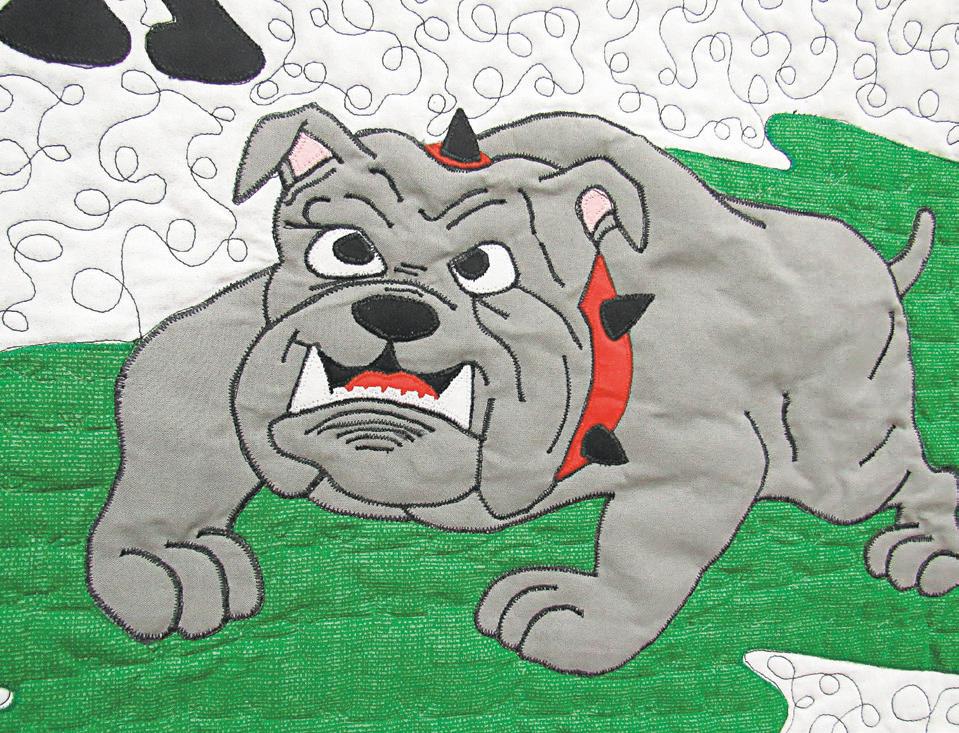 The quilt features a feisty bulldog and the caption “48 consecutive Football Wins, 2014-2017.” Look carefully and you’ll see words and bulldog paw prints stitched into the quilt.